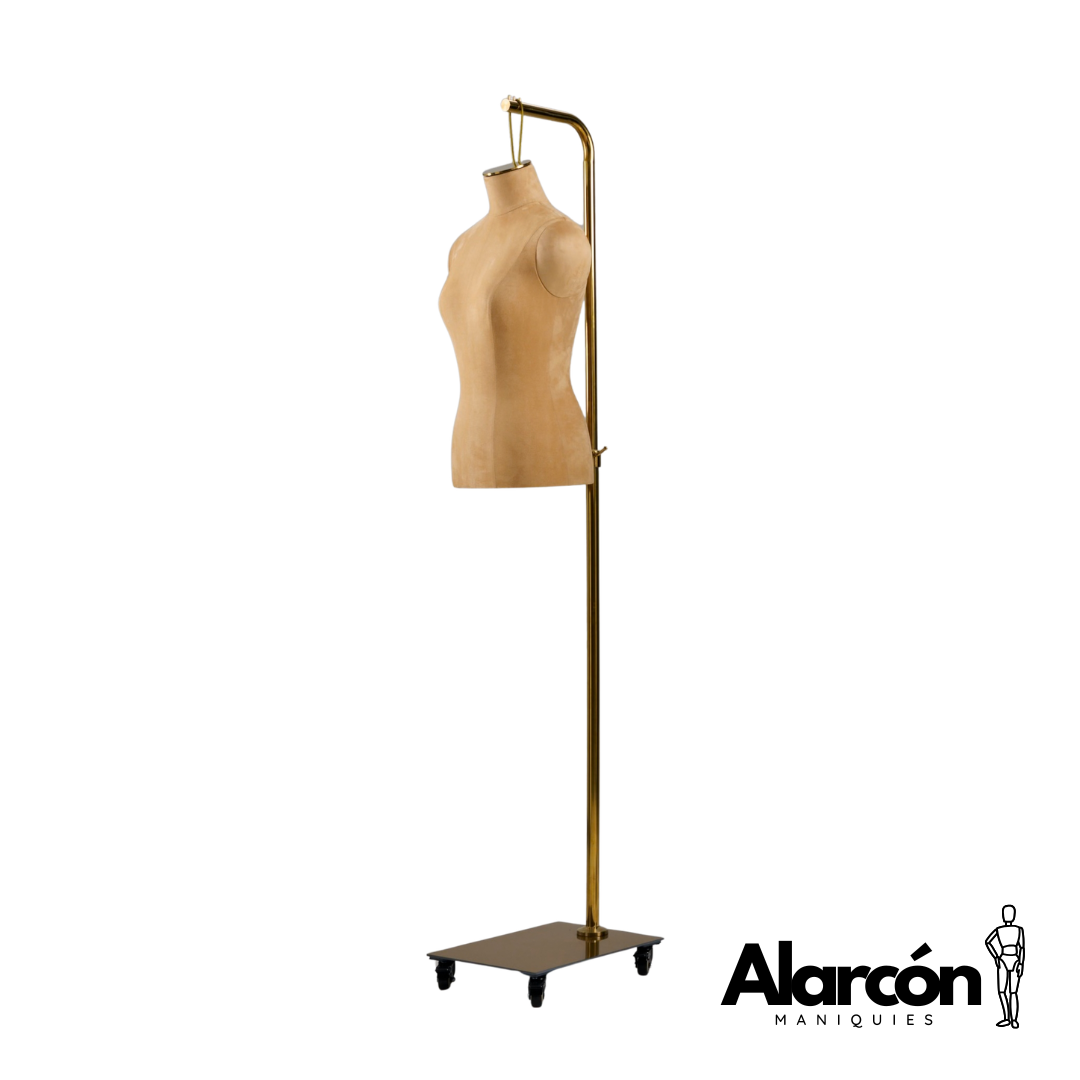 Maniquí de mujer colgante de tela aterciopelada con pie dorado con ruedas.