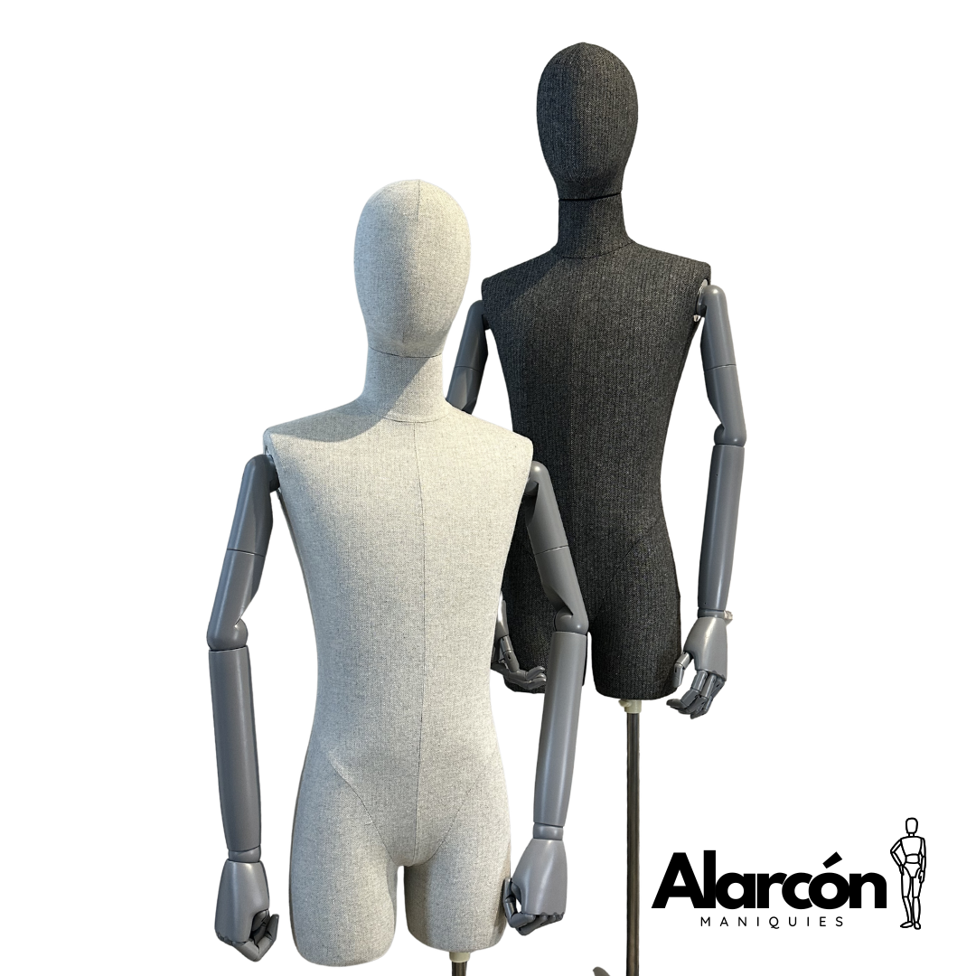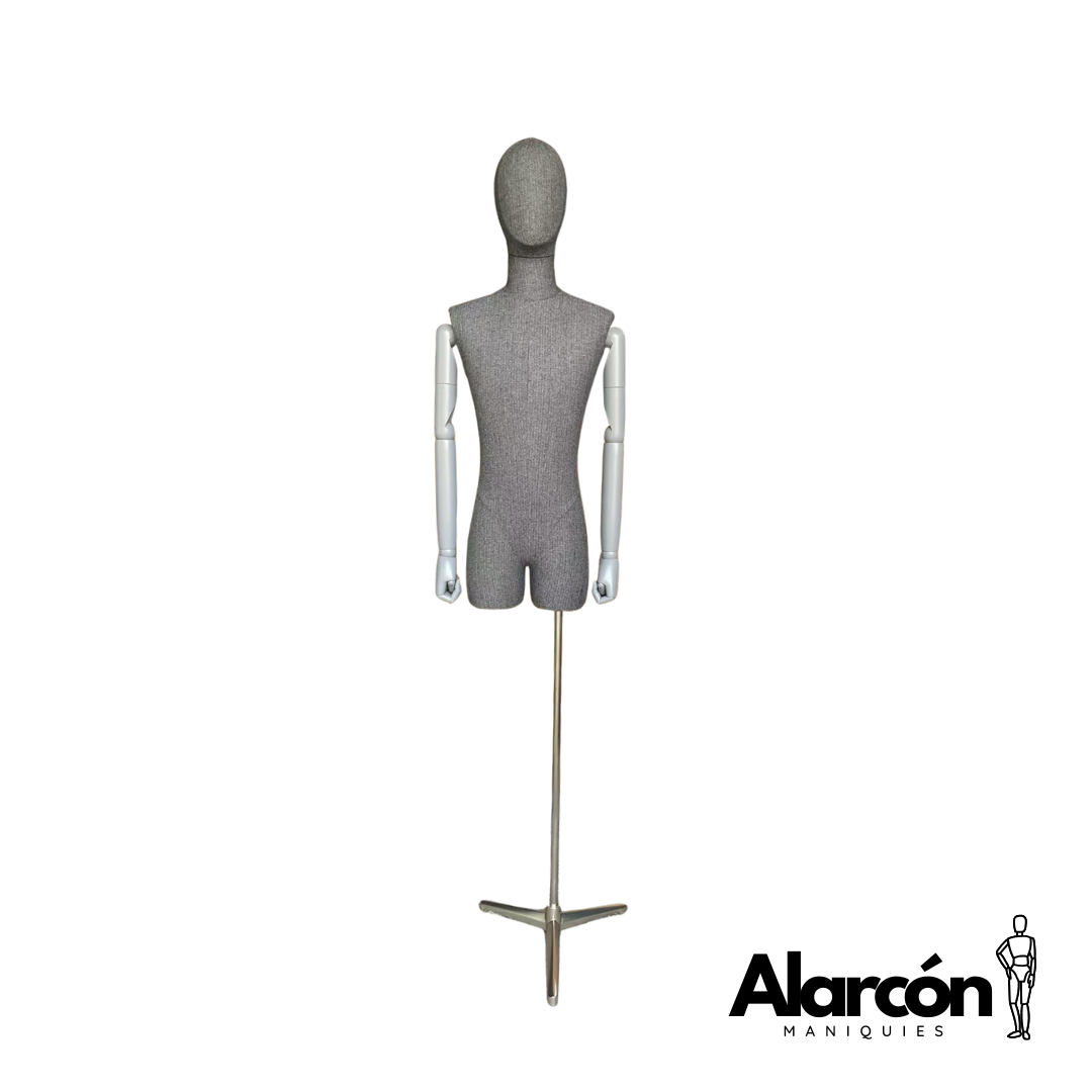 Torso de hombre tapizado en tela, brazos y dedos articulados y base metálica regulable en altura. Ideal para exhibición.
